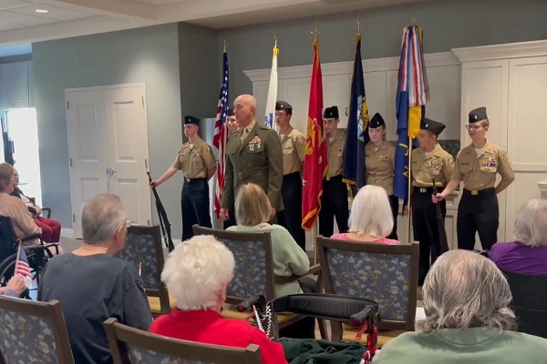 Springpoint Living at Manalapan had a special visit from the Colts Neck High School Naval Junior ROTC. Led by Major Gregory J. Penczak, USMC (Ret.), several residents joined the Cadets in a lovely rendition of “God Bless America.”