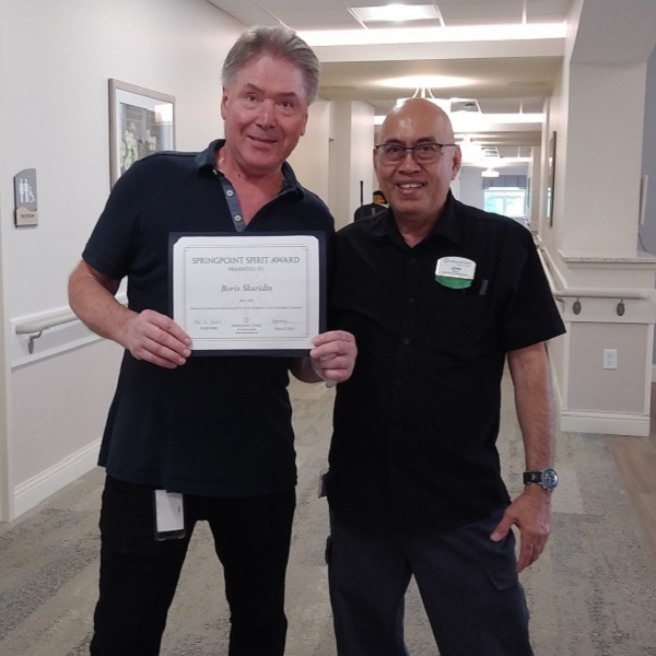 In 2022, Springpoint began assisting refugees from Afghanistan and Ukraine with employment opportunities in our communities through Interfaith-Rise (Refugee and Immigrant Services and Empowerment), a nonprofit organization based in Highland Park, NJ. Springpoint provides resources and support for program participants to find employment placement in one of our communities. Boris Skuridin, originally from Ukraine, participated in the program and is currently employed at the Springpoint Living in Manalapan Assisted Living and Memory Care community. In May, Boris received the Springpoint Spirit Award for exceeding expectations and providing the best service possible to residents.